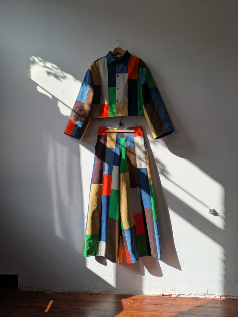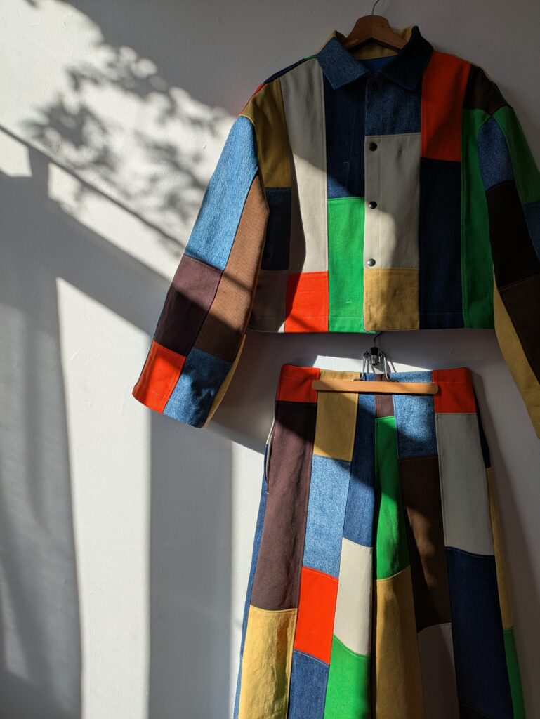 A playful patchwork denim set in shades of blue, warm browns, bright yellow and green, finished off with a pop of orange. A palette that couldn’t be more her.